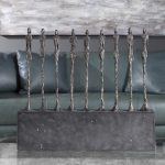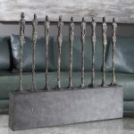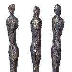 Textured figurines with an appearance of hand molding, finished in a heavily aged gold and displayed on a porous aged black base.