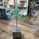 Realistic starfish replica features a pale, marine green finish and sits atop a tarnished silver stand.80