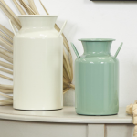 This metal vase features a milk jug shape with handles, adding a touch of elegance and functionality to their design.