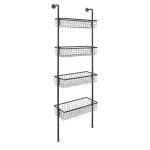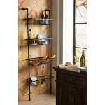 1. This industrial style four-basket shelf features the look of metal piping and wire baskets, great for added storage and style.