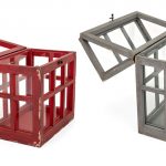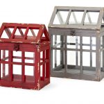 These wood and glass terrariums resemble miniature greenhouses and feature clear glass panes with rustic finishes in grey and red paint.