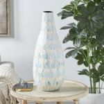 The intricate pattern of the hand applied mosaic design adds a unique touch that elevates the decor with its natural beauty and texture in this mother of pearl vase.