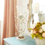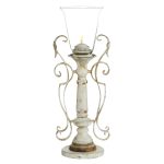 White candle holder with bronze textural detail and layers of chipped and worn paint revealing muted green for an antique look; Chinese fir wood spindle candlestick body; hurricane glass cover for pillar candle plate