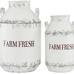 This farmhouse style inspired design white iron milk can features a distressed white finish on connecting segments to the cylindrical body furnished with 2 curved handles