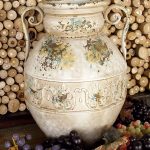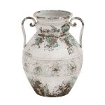 This round distressed vase features solid scrolled handles and a multicolored finish