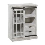 This rustic-style wooden cabinet features four separate shelves, a glass door, and two drawersWipe clean with a dry clothMetal accents are attached to wooden cabinet with carved overhang table top