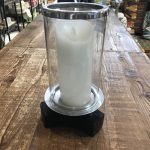 It is tastefully designed with attention to many compelling details. The glass chimney is accented on each end with metal rings. The feet are charming metallic orbs supported by a wooden base in a black finish.