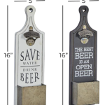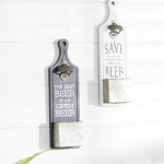 These farmhouse kitchen wall signs are shaped and metal-accented as bottle openers